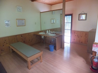 浴槽の左に 男女の脱衣所がありますが、脱衣所の中は簡素な脱衣棚があるだけです。