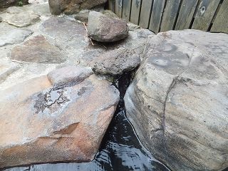 _____(露天風呂の湯口)_____________(浴槽の溝から流れ出る温泉)