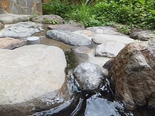 滝見の湯の露天風呂は3人が入れる大きさの岩風呂で、奥に 温泉の名前の由来になった