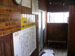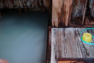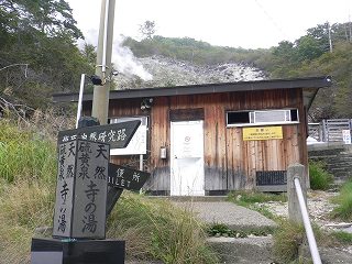 (寺の湯) ※ 清掃日は不定。 最後に行った寺の湯は 裏手の山腹から勢い良く水蒸気が上っていて、これ以上に新鮮な 温泉は考えられないロケーションですが、これだけ成分の強い温泉に 立て続けに3つも入る のは 体への負担が大きいと考えて、この日は入るのを止めました。 ※ 新湯温泉のデータによるとPH2.2で、3つの共同浴場の中で もっとも酸性度が高いです。 ![]() _______(寺の湯)________________(寺の湯の案内) 2006年11月4日に 近くにある高原山に登った時に寺の湯に入りました。 こちらの温泉は混浴で 男女の脱衣所の間にも仕切りが無いので、女性が ここを利用する のは難しいと思います。 (寺の湯の脱衣所)浴室には 温度違いになった2つの浴槽があって、左側は くつろげる程度の温度で、右側の 浴槽は かなり温度が高かった。 ※ 近くに蛇口がありましたが、右側の浴槽には水を入れないのが決まりのようです。 (寺の湯の浴槽)