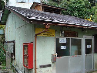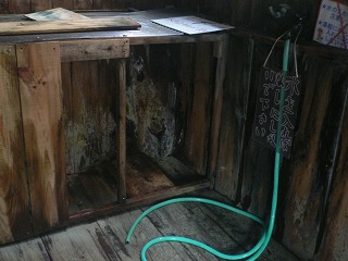 (むじなの湯)※ 清掃日は月曜日と木曜日の9時頃〜16時頃まで。 最初に 寺の湯の前にある長い階段を下りた所にある むじなの湯に入りました。 ![]() ___(寺の湯の前にある案内板)_______(共同浴場らしい外観の むじなの湯) 入り口にある料金箱に300円を入れて利用します。 (料金箱)狭い脱衣所から一段下がった所に小さな浴槽があって、常連だという人が「普段はもっと 熱いんだが 今日は誰かが水を入れ過ぎたようでぬるい」とボヤいていたので 安心して足を 入れたら 熱っちーい! (むじなの湯)「これでも ぬるいんですか」と聞いたら、「そこの穴にある源泉を見たら分かるだろう」 と言う ので 中にあった源泉に触ろうとしたら「火傷するぞ!」と言われました。 確かに熱そうです。 (穴の奥に見えた源泉)近くにあったホースにも「水を入れっぱなしにしないで下さい」と書かれていて、とてもじゃ ないが 水を足せる雰囲気ではありませんでした。 (注意書きが付いたホース)温泉は熱いし 浴槽は4人が限界なのに次々と人が入ってくるしで長居できませんでした。 ※ 以前は 中に仕切りが無くて混浴だったそうですが、現在は男女別に分かれています。