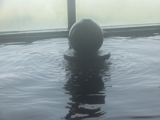 浴室の窓側にある大浴槽は15人が入れる大きさで、浴槽の中央にある球体から温泉が出て