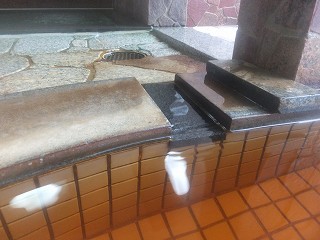(浴槽の縁にある溝から流れ出る温泉)