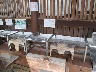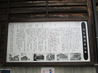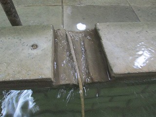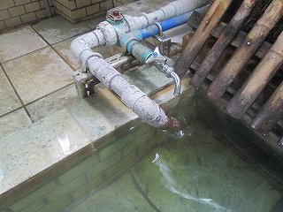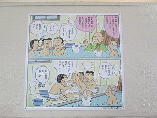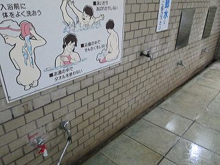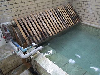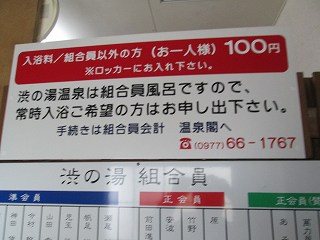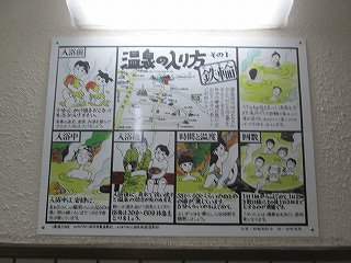 外壁に 渋の湯温泉沿革と渋の湯入浴心得三ヶ条が書かれていて、男女の入り口の間に 温泉神社と書かれたお地蔵さまがあります。 ![]() ____(渋の湯温泉沿革)________________(お地蔵さま) 脱衣所にあるコインロッカーの利用料金が入浴料になっているので、外来者はスチール製の 有料ロッカーを利用します。 ![]() _____(入浴料の案内)__________(組合員用脱衣箱と外来者用ロッカー) 脱衣所は着替えるスペースだけで 洗面台はありません。 (脱衣所にある腰掛け)浴室と脱衣所の間には戸が無くて、浴室に入ると 右に洗面器とイスが並んでいます。 ここにある温泉分析書によると 源泉名は別府市営 渋の湯温泉で、泉質は ナトリウム- 塩化物泉です。 ![]() ____(洗面器・イス・手桶)______________(温泉分析書) 左の壁に4つの水の蛇口がありますが、鏡があるだけで 物を置く台はありません。 ![]() ______(浴室の天井)_________________(洗い場) 浴槽は5〜6人が入れる大きさで、浴室の床と浴槽の中には 肌触りの良い十和田石が 使われていて、浴槽の奥に 竹製の冷却装置があります。 ![]() _(床に十和田石が使われた浴室)__________(竹柵の中に冷却装置) 湯口が浴槽の中に入っていたので 味は分かりませんが、温泉は わずかに温泉臭がして 肌触りにツルスベやヌルスベなどの特徴を感じませんでした。 温泉は源泉かけ流しで、浴槽からあふれた温泉は 縁にある溝から流れ出ています。 ![]() ___(源泉のパイプと水の蛇口)_________(浴槽からあふれ出る温泉) 浴室の壁に 組合員と立ち寄り客の心構えと温泉の入り方が書かれていました。 ※ 温泉の中で説教をしているのは一遍上人です。 ![]() __(組合員と立ち寄り客の心構え)____________(温泉の入り方)