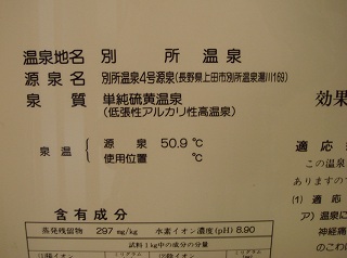 上信越道の上田菅平インターから上田バイパス経由で143号線を20Km。 別所温泉駅の隣にある大きな立ち寄り入浴施設で駐車場も広い。 ![]() ______(別所温泉駅)_______________(あいそめの湯) 玄関の横に大きな足湯があります。 (足湯)明日は子どもの日ということで 玄関では五月人形が出迎えてくれて、ロビーの天井には 大きなつるし飾りが下がっていて、テレビの横には常田獅子の大うちわが飾られていました。 ![]() _______(五月人形)_____________(ロビーの つるし飾り) 券売機で購入した入浴券を受付に出します。 ![]() ________(受付)____________(浴室の入り口に掛かる湯のれん) 脱衣所には 定期的に女性の係員が入って掃除をしてくれていたので清潔感が保たれて いましたが、出来れば 男湯は男性の清掃係にやって欲しかった。 脱衣所の横に別料金(500円)の岩盤浴がありましたが、私は利用していないので分かり ません。 ![]() _______(洗面台)__________________(脱衣棚) 脱衣所にある温泉利用によると 源泉名は別所温泉4号源泉で、泉質は 単純硫黄温泉です。 (源泉名と泉質)石材を使った浴室は豪華な感じで、浴室の床と浴槽に使われた十和田石の触感も良い。 ※ 左に掛け湯があって 右奥に洗い場が並んでますが、ソープ類は安っぽかった。 ![]() _______(掛け湯)__________________(洗い場) 内湯の窓側にある大浴槽の温泉は ゆで玉子の味がして、肌触りは ツルスベです。 ※ 浴槽からあふれた温泉は、排水口ではなく 窓側の回収溝に流れ込んでいます。 (内湯、浴槽の右に温泉の回収溝)露天風呂は敷地が広くて、すぐ横を小川が流れて 柵の奥にはのどかな景色が広がって いますが、浴槽は小さかった。 ※ 彼方に見えた2つの冠雪の頂は飯縄山のようでしたが、断定するには至りませんでした。 ![]() __(浴槽の右側に温泉の回収溝)___________(柵越しに見た景色) 浴室に 飲泉専用の蛇口から出ている源泉があったので飲んでみたら、浴槽の湯口から 出ている温泉よりも強い ゆで玉子の味がしました。 (飲泉専用の蛇口)