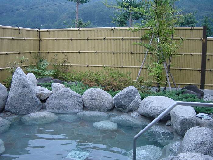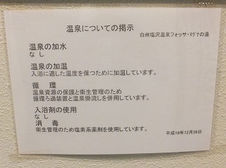中央道の小淵沢インターを出たら20号線を北上し、道の駅信州蔦木宿を見送った先で 左に 架かる橋を渡ると その先にあります。 (前回撮影したフォッサ・マグナの湯)白州福祉会館と書かれた建物の中に入ったら 券売機で購入した入浴券を受付に出します。 ![]() _______(券売機)__________________(受付) 受付前のホールがフィットネスコーナーになっていて、その隣に2階に登る階段がありますが、 この時は 時間が遅かったので封鎖されてました。 ![]() ____(2階に上がる階段)____________(フィットネスコーナー) そこから左にある廊下を歩いた先に浴室の入り口があります。 (浴室の入り口に掛かる湯のれん)廊下にある温泉分析書によると 源泉名は白州塩沢温泉、泉質は ナトリウム・カルシウム- 塩化物泉で、温泉についての掲示によると 加水はしていないが加温・循環・消毒をしている とのことです ![]() ______(温泉分析書)_____________(温泉についての掲示) 脱衣所は適度な広さで、脱衣棚には鍵が掛かるロッカーとプラスチックの籠があります。 ![]() _______(脱衣棚)_______________(洗面ドレッシング) 浴室に入った所に源泉汲場があって、ここの蛇口から出ている温泉は 強い硫化水素臭と ゆで玉子の味がしました。 (源泉汲場)源泉汲場の向かいに立って使うシャワーと2つの洗い場があって、左奥に 6つの洗い場が あります。 シャワーは出したり止めたりできるタイプで使いやすいが、ソープ類は安っぽかった。 ![]() ___(立って使うシャワー)_______________(洗い場) 内湯には高温浴と微温浴(寝湯)の2つの浴槽があって、左の高温浴槽は適温で塩素臭を感じ なかったが、右の微温浴槽は 温度がぬるくて塩素臭がしました 高温浴槽の壁に 山梨県の温泉施設で良く目にする田中教授の温泉特性があって、他所の 温泉施設と同じようなことが長々と書かれていました。 ![]() _____(左が高温浴槽)_____________(田中教授の温泉特性) 高温浴槽は 湯口から大量の温泉が投入されていて、浴槽内に2連のジェットが出ています。 ![]() ____(高温浴槽の湯口)______________(2連のジェット) 2つの浴槽は縁に切れ込みがあって、微温浴の浴槽はオーバーフロー気味になってますが、 高温浴の浴槽はオーバーフローを確認できませんでした。 ![]() _____(微温浴・寝湯)_______________(微温浴の湯口) 露天風呂の出口の所にサウナと水風呂がありましたが、私は どちらも使っていないので 分かりません。 ![]() _______(サウナ)__________________(水風呂) 露天風呂は花崗岩を組んだ岩風呂ですが、今回は暗くて撮影できなかったので 前回撮影 した画像を貼り付けておきます。 下の画像の左にある三角の石の右下が湯口ですが、湯口から出ている温泉の量は 浴槽の 大きさにに対して少なかった。 温泉は無色透明・無味で 岩石を砕いたような匂いがします。 前回の露天風呂では濃厚なヌルスベ感がしたのをハッキリ覚えているのですが、今回の 肌触りはギシギシした感じでした。 (前回撮影した露天風呂)