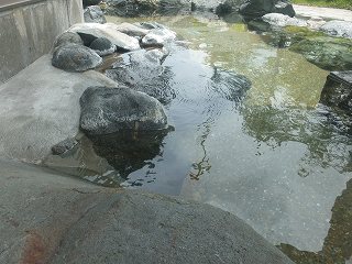 露天風呂に出ると、内湯の建物の壁に沿って 鍵型の10人が入れる岩風呂があって、(画像 には映ってませんが)その奥に 数脚のガーデンチェアーと小さな東屋がありました。 露天風呂の広い庭にはアジサイが咲いていて、その奥に大きな桜の木があって、目隠しの 塀が一部にしかないので開放感があります。 ![]() ______(露天岩風呂)________________(露天風呂の広い庭) 露天風呂も温度がやや高めで 塩素臭がきつかった。 (露天風呂の湯口)