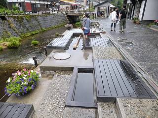 和楽足湯から奥を見ると、温泉街の中心を流れる川の両岸に 歴史を感じさせる旅館が