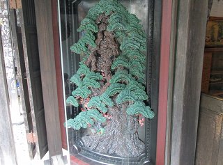 玄関の左に精巧な透かし彫りの松があって、右に 招き猫のように手招きをしている 招き