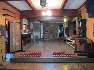 古山閣のロビーには 火縄銃や大きなお面があって、天井の梁も凝った作りです。