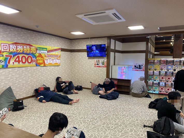 露天に出ると右上にテレビを見ながら8人が入れる天然温泉檜風呂