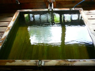 かけ湯は 温泉と水が入った木箱から それぞれ適量を汲んで使うのですが、この割合が