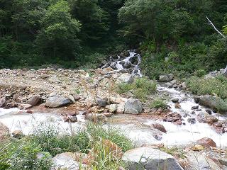 _(目の前で川と沢が合流してます)__________(炎天下の野天風呂)