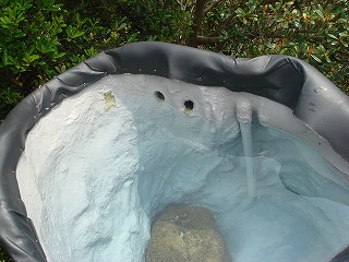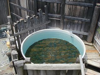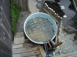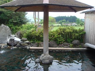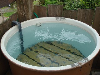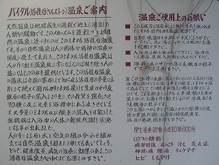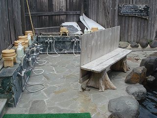 ※ 天然温泉ではありません。 東名の裾野インターから24号線を北西に走って「須山」の信号を右折すると 5分であります。 (露天風呂の外観)レストランと露天風呂とキャンプ場が併設された施設の駐車場には沢山の車があったので 混雑を覚悟してましたが、中に入ると客が1人もいませんでした。 ![]() _(浴室の入り口に掛かる湯のれん)__________(脱衣所の洗面台) 脱衣所にある「ヘルストン活性石温泉」を見て、温泉が目的の人は 近くにある もっとキレイな 作りの天然温泉御胎内温泉に行って、駐車場の車は 食事の人なのだと分かりました。 ![]() ___(ヘルストーン活性石温泉)________-(説明書き、クリックで拡大) 洗い場は内湯と露天風呂にありますが、露天の方には鏡がありません。 ![]() _____(内湯の洗い場)_______________(露天の洗い場) 内湯の浴槽は4〜5人が入れる岩風呂で 壁に大きな木があります。 露天風呂と仕切る壁の下に隙間があるので、直接 内湯の浴槽から露天風呂に行けます。 ![]() ____(内湯の壁の巨木)___________(内湯から露天風呂に出る隙間) 露天風呂は20人が入れる大きさで 浴槽の中央に六角形の屋根が付いています。 (右の隙間が内湯の抜け穴)露天風呂から一段上がった所に 4〜5人が入れる「諸味風呂」という丸い浴槽があります。 (諸味風呂)大野路の一番の名物は 樹齢400年といわれるシイの巨木を削りだして造った天辺風呂です。 ![]() _____(巨木 天辺風呂)__________(天辺風呂に登るハシゴ) 巨木の最上部を くり抜いて造られた天辺風呂は 内側に白いコーティング剤が塗られていて、 縁に 黒い塩ビの保護シートが取り付けられていて、いい感じに体にフィットする大きさです。 (天辺風呂の浴槽)天辺風呂は キャンプ場が一望できる素晴らしい展望です。 ![]() __(天辺風呂から見た露天風呂)________(天辺風呂から見たキャンプ場) この時の利用客は私だけだったので 女性用の風呂を見てみました。 ※ 女湯を覗くのは 利用者がいなくても軽犯罪法違反になりますから、マネしないでください。 ![]() _(男湯よりも一回り小さい露天風呂)_________(女湯の諸味風呂) 女湯には 映画「戦国自衛隊」のオープンセットの櫓で作った 富士山 天空風呂があります。 ![]() ____(富士山 天空風呂)______________(櫓に登るハシゴ) 富士山 天空風呂の最上部には、下の諸味風呂より一回り小さい浴槽が設置されています。 (天空風呂の浴槽)