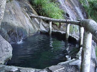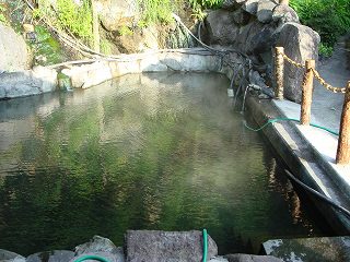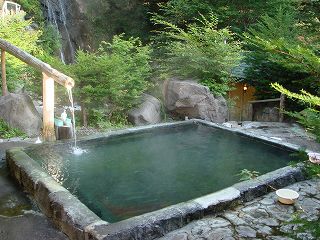 (温泉) 内湯は 男湯と女湯に分かれていた名残りで、浴槽が2つに仕切られています。 (2槽に分かれた内湯)露天風呂は 女性専用以外は全て混浴です。 一番上にある石南花の湯は一番小さくて、源泉が 岩に刺さったパイプから出ています。 ![]() __(一番上にある石南花の湯)________(9時の位置に黒いホースが見える) その下にある一番大きなコンクリートの浴槽では(誰もいなかったので)泳げました。 (一番大きな浴槽)温度は 脱衣所の前にある雪見の湯の浴槽が少し熱めで、それ以外の浴槽は ぬるめです。 (雪見の湯)一番下にある滝見の湯は、紅葉の時期に 風情のある滝を眺めながら入ると良さそうです。 全ての浴槽が源泉掛け流しで、温泉の中には沢山の湯の花があり 強い硫化水素臭がして 肌触りはツルスベです。 (滝見の湯)