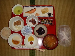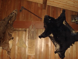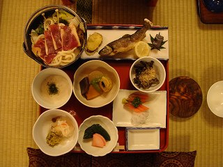(食事) 大広間での食事は 広い部屋の半分に集まって食べましたが、そのおかげで隣の人の 会話が聞こえて、皆さんが 事前に色々と調べてきた情報を仕入れることができました。 ![]() ____(夕食の食事風景)__________(食堂の壁に貼られた鹿と熊の毛皮) 料理は 一時悪評だったようですが、現在は 料金に比べて遜色のない味になっています。 ※ 夕食はフラッシュを使わないで撮影したために見にくいが、鴨鍋と岩魚の塩焼きです。 ![]() ________(夕食)___________(朝食、右のビニール包みは弁当)