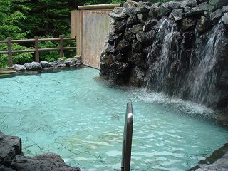 露天風呂にも2つの岩風呂があって、右手前の浴槽は 高い石組みから滝のように温泉が