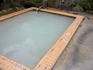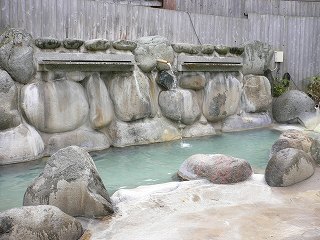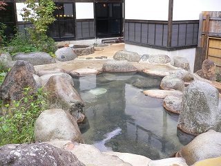 (ひらゆの森)ひらゆの森は 築300年以上の飛騨高山の古民家を移築したそうで、浴室は 太い梁と漆くい で作られた長い廊下を歩いた先にあります。 (浴室に向かう廊下)浴室の高い天井は黒い梁がむき出しになっていて 窓側に大浴槽があります。 温泉の温度は低めで 硫化水素臭がする温泉には沢山の湯の花が浮かんでいます。 ※ 内湯は 薄暗いうえに入浴者が絶えなくて、浴槽の写真を撮れませんでした。 ![]() (オフィシャルサイトから無断で拝借した画像)____(同じく、内湯と洗い場) 露天風呂は広くて、広大な敷地に 男女合わせて16の浴槽があります。 ![]() (露天風呂に出た所にある円形の浴槽)_______-(その奥にある岩風呂) 露天風呂には 岩風呂・ヒノキ風呂・打たせ湯などの趣向を凝らした浴槽がありますが、 それぞれの浴槽は源泉が違うようで 色や濁りに微妙な差があります。 ![]() ___(奥の壁の所が打たせ湯)______________(打たせ湯) 露天風呂の周囲は森に囲まれているので自然を満喫できます。 (壁側が浴槽で 茶色い部分が通路)露天風呂の一番奥にヒノキ風呂と岩風呂の白濁の温泉があります。 ![]() (縁に滑り止めの溝がある 木の浴槽)_____________(岩風呂)