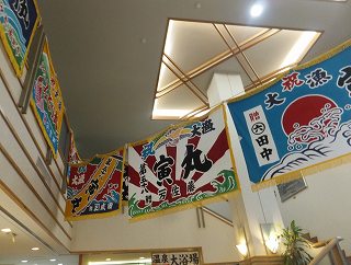 近くにある南茅部の漁師の利用が多いのか、壁や天井に 大漁船の写真と大漁旗が飾られて