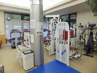クランク状の長い廊下を歩いて行くと 右にトレーニングマシンが並んでいて・・