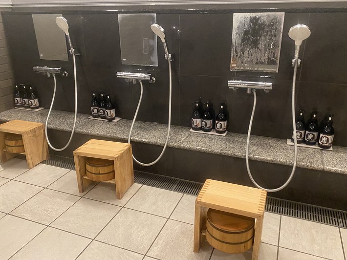 浴室の左にある7つの洗い場はシャワーヘッドが大きくて使いやすい。