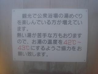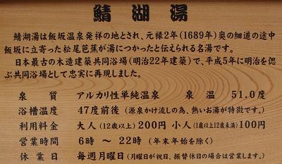 東北道の福島飯坂インターから13号線を北西に走り、線路を渡ったら右折して 飯坂温泉駅の 手前にある信号を直進して最初の交差点から左上に登って行くと 左に観光会館パルセ飯坂 があって、道路を挟んだ向かいに10台ほどの駐車場があります。 (パルセ 飯坂)駐車場から八幡湯の前を通って 神社から右下に下りて通りに出ると 足湯と鯖湖神社が あります。 ![]() ___(足湯、あ〜しあわせの湯)_____________(鯖湖神社) 鯖湖神社の奥にあるヒバ造りの鯖湖湯は、道後温泉の坊ちゃんの湯よりも古い日本最古の 木造建築の共同浴場でしたが、平成5年12月にリニューアルされました。 ![]() _____(鯖湖湯の全景)_______________(鯖湖湯の看板) 飯坂温泉の共同浴場は 近くにある入浴券売りさばき所で入浴券を購入するのですが、 鯖湖湯は 番台の所にある自販機で入浴券を購入できます。 (番台と入浴券の自販機)外観も浴室も新しくなっていますが、脱衣所周りだけは 以前のままの状態です。 脱衣所と浴室の間にはチョッとした段差があるだけで 仕切りはありません。 ![]() (脱衣棚、左右に カギ付きのロッカー)________(歴史を感じる洗面台) 浴室は真新しい御影石造りで共同浴場とは思えないほどキレイですが、イスと洗面器がある だけで カランはありません。 (イスと洗面器)浴槽も御影石造りで、縁に 高級感のある黒い御影石が使われています。 飯坂温泉は熱めなのですが、私の前に入っていた親子連れが加水をしたのか、こまめに清掃 しに来ていた番台さんが気を使ってくれたのか、八幡の湯に比べたら ずっと入りやすい温度 でした。 (御影石造りの浴室と浴槽)温泉は100%の源泉掛け流しだと思いますが、湯口には飲めないと書かれていました。 温泉は無色透明・無味無臭で サラサラした肌触りです。 (湯口に書かれた注意書き)浴室の2ヶ所にある上がり湯の蛇口にはホースが取り付けられていて、浴室の壁に 観光客 に配慮した書き込みがありました。 共同浴場を利用させていただけるだけでもありがたいことで、熱い温泉を楽しみにしている 地元の人の事を考えると なかなか加水しにくいですね〜。 ![]() ____(壁にある書き込み)_______________(上がり湯)