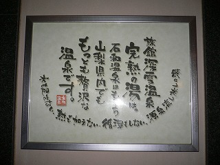 中央道の一宮御坂インターから137号線と20号線を走り、「長塚」の信号を右折して笛吹川を 渡ったら411号線を左折して、「石和温泉駅入口」の信号から2つ目の「甲運橋東詰」の信号を 右折。 (旅館 深雪温泉)玄関を入ると 右に受付があります。 ![]() _____(玄関にある木)_________________(受付) ロビーは白を基調にした清潔感がある作りで、左にあるイスの奥に喫茶のカウンターがあって 正面に土産物が並んでいます。 ![]() _______(ロビー)_______________(土産物コーナー) 洗い場のソープ類は炭の石鹸で シャワーにも温泉が使われています。 この日は他に利用客がいなくて貸し切りの状態で利用できましたが、源泉かけ流しの温泉は 空いていることも重要な要素だと思っている私にとって これは嬉しかった。 (洗い場の桶は椅子の下に収納)浴室は「柿の湯」と「ももの湯」に分かれていて、この時は「ももの湯」が男湯でした。 浴槽は10人が入れる大きさで 源泉掛け流しの温泉は飲泉も可能です。 源泉には 硫化水素臭がする完の湯(50.8度)と、鉱泉のような熟の湯(36度)があります。 (ももの湯)「旅館 深雪温泉の完熟の湯は、石和温泉はもとより 山梨県内でも最も贅沢な温泉です。 水も足さない、熱も加えない、循環もしない、源泉流しっ放しの湯」 (浴室にある案内書き)石板張りの露天風呂は 周囲を高い柵に囲まれているので開放感はありません。 (ももの湯の露天風呂)他に客がいなかったので「柿の湯」を覗いて見たら、こちらの掛け流しの量は「ももの湯」以上 で、大量の源泉が ザアザアと音を立てながらオーバーフローになっていました。 (柿の湯の内湯)_____ - - - - - - - - - - - - - - - - - - - - |