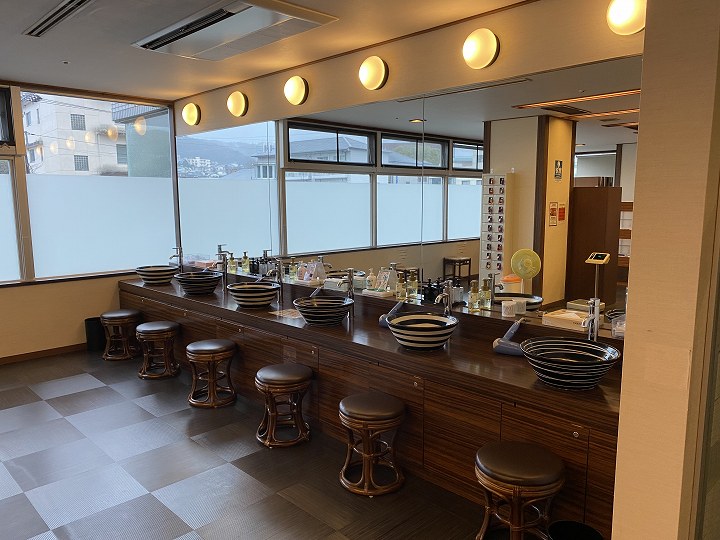 浴室に入ると左右の壁に洗い場が並んでいます。