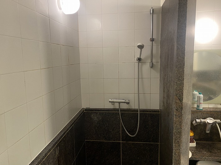 浴室に入ると左に立って使うシャワーがあって その奥に4つの