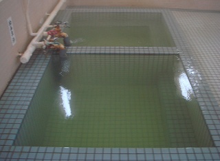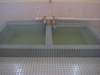 浴室の奥にある2つの浴槽は 源泉を出す量で温度を調整するようになっていて、左側の浴槽