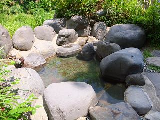 露天風呂は20人が入れる岩風呂で、左上にある 源泉の湧出口を保護していると思われる