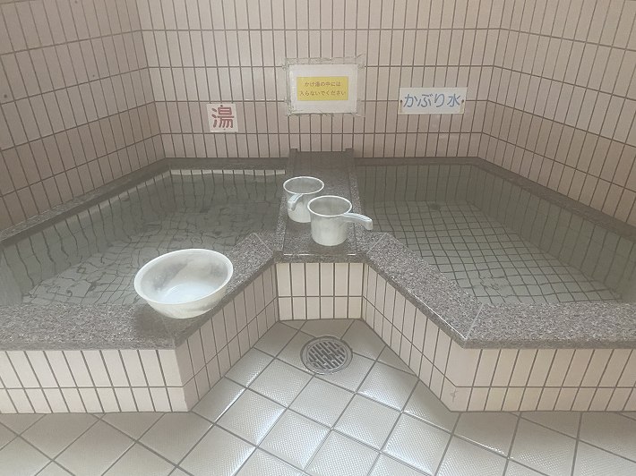 浴室の中央手前に湯と水が入った かぶり湯があります。