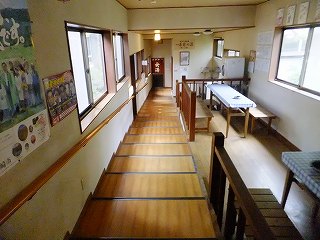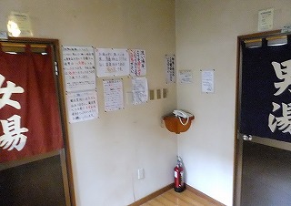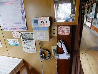 (もう1つの300円の温泉) 受付の向かいにある廊下を歩いて行くと 右に長イスと長テーブルがあって、そこに 有料 (100円)のドライヤーがあります。 ![]() ____(廊下にある休憩所)_____________(有料のドライヤー) その先に 太い木の柱と丸太で作ったブランコがあって、その奥に自販機が並んでいます。 (右が丸太のブランコ)突き当りから左下に下りて行くと その右にテーブル席があって、その隣に 湯治客用らしい 乾燥機付きの洗濯機と流し台があります。 ![]() (階段状になった廊下とテーブル席)___________(流しと洗濯機) 洗濯機の下に浴室の入り口があって、その周りに 色々な注意書きが張られていました。 (浴室の入り口に掛かる湯のれん)脱衣所は縦長で 右の壁が木枠の脱衣棚になっています。 (300円温泉の脱衣所)こちらの温泉はソープ類がないということで敬遠したのですが、脱衣所も浴室も浴槽も こちらの 方が数倍大きかった。 ※ トラベルサイズのソープ類を持っていたので こっちに入れば良かった。 (大きな浴槽)(湯上り) 温泉から上がった後、ロビーの休憩室にある(一昔前の事務所で見たことがある)革張りの イスで休みました。 (休憩室)
