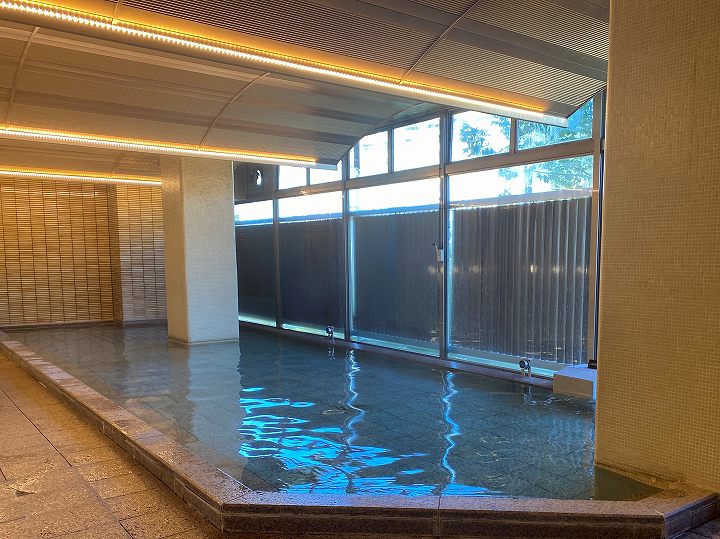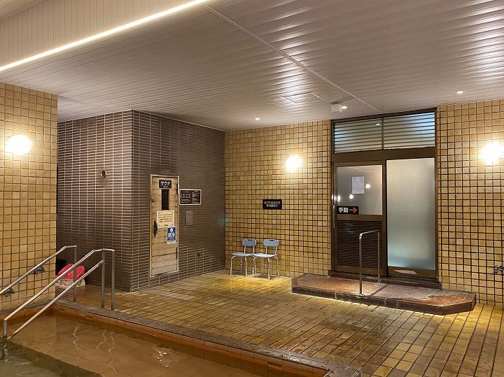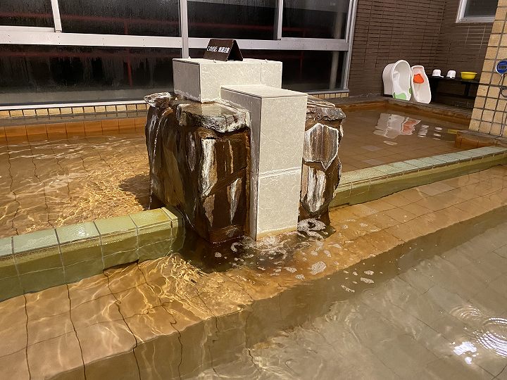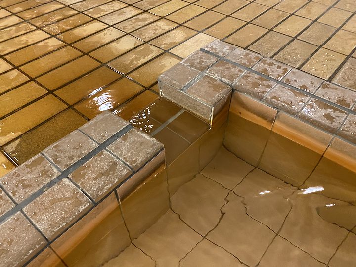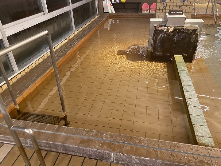 浴槽は10人が入れるタイル張りの浴槽で、無色透明・無味無臭の温泉はキュッキュとした