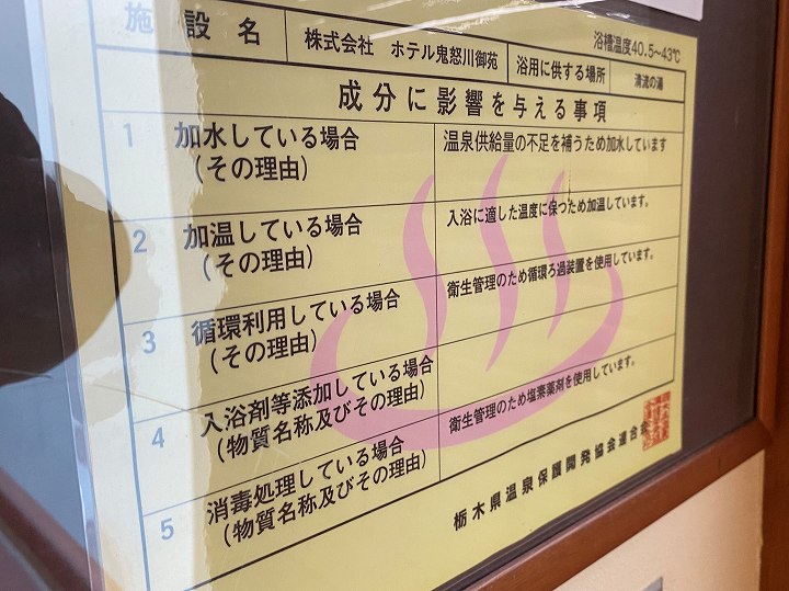 入口にある温泉分析書によると 源泉名は鬼怒川温泉(源泉名 鬼怒川温泉・川治温泉観光