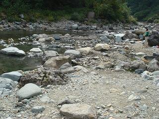 河原に出た所が天然手掘り温泉の野天風呂ですが、すでに沢山の浴槽が掘られてました。