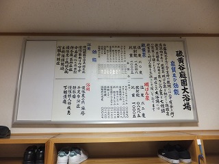 ![]() _______(霧島ホテル)__________(坂本龍馬とお龍の湯治記念碑がある庭園) エントランスに屋久杉の巨木があって、季節がらロビーに五月人形が飾ってありました。 ![]() ________(屋久杉)__________________(五月人形) 広いロビーの右奥にフロントがあって・・ ![]() ________(ロビー)__________________(フロント) その隣にある 坂本龍馬を紹介したコーナーには、龍馬が 姉の乙女さんに宛てた手紙と 龍馬が使っていたスミスアンドウェッソンの銃のレプリカが展示してあります。 (奥の壁に坂本龍馬の写真) ![]() ___(坂本龍馬の手紙のレプリカ)_________(坂本龍馬の拳銃のレプリカ) ロビーからエレベーターで2階に上がると、浴室に行く廊下にも 沢山の霧島に関する歴史的 資料が展示してあります。 ![]() _____(坂本龍馬コーナー)_____________(歴史と温泉の部屋) ![]() ____(龍馬と西郷の出会い)________________(硫黄谷太鼓) 突き当たりにある部屋でカウンターに入浴券を渡すと フェイスタオルを渡してくれます。 ![]() ___(浴室の前にあるカウンター)__________(カウンターの前にあるイス) 浴室の入り口に有料(100円)のロッカーがあるので、貴重品は こちらに入れます。 (ロッカーと脱衣所の入り口)入り口にある硫黄谷庭園大浴場の泉質及び効能によると 三十万坪の敷地に二十有余ヶ所の 湯源地があるそうです。 温泉成分表は2種類あって、源泉名:硫黄谷13号の泉質は単純酸性硫黄温泉で、源泉名: 硫黄谷12号の泉質は単純酸性温泉です。 源泉かけ流しですが、温度調整の為の加水と衛生上の理由で塩素系薬剤を使用してます。 ![]() _(硫黄谷庭園大浴場の泉質及び効能)_____________(温泉成分表) 脱衣所自体は広いのですが、中央にある籐製の脱衣籠が載った台が狭くしています。 ![]() _____(中央にある脱衣棚)______________(洗面ドレッシング) 浴室に入ると 最初に洗面の部屋があり、もう1枚の戸を開けると 左に垢すり台があって・・ ![]() ________(洗面台)_________________(垢すりコーナー) 右の壁に ズラーと洗い場が並んでます。 (洗い場)_________________ _____ - - - - - - - - - - - - - - - - - - - - - - - - - - - - - - - - - - - - - - - - - - |