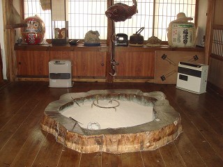 _(テーブルの奥に板の間の部屋)__________(板の間にある囲炉裏)