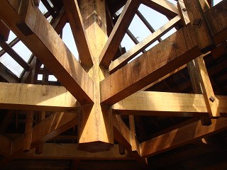 天井は六等分した梁で支えられていますが、中央の柱が 浴槽の真上で切断されています。