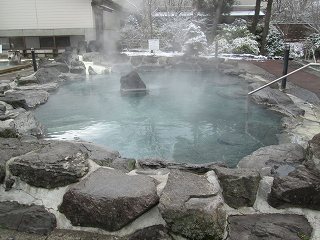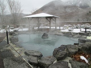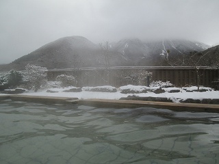 露天風呂は広くて、この時は 前夜に降った雪のおかげで(九州の温泉で考えてもみなかった)