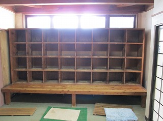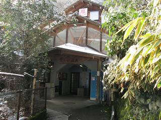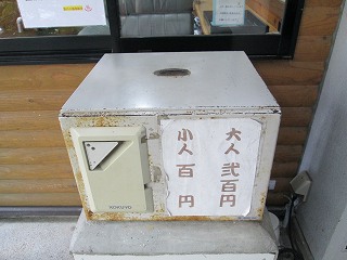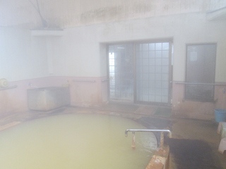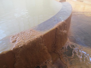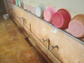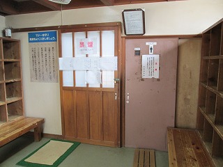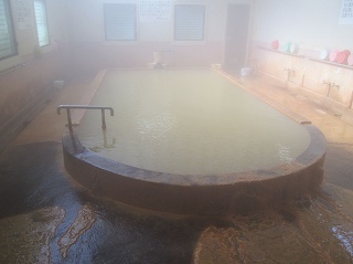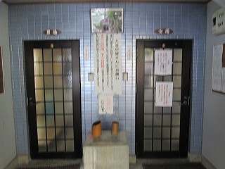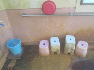 駐車場は新清館の駐車場を使わせてもらうので、共同浴場の利用者は 入浴料金の他に 200円の駐車料金が必要です。 ![]() _____(旅館 新清館)______________(筌ノ口温泉の入り口) 入浴料金は 受付けの前にある料金箱に入れます。 (料金箱)受付の奥に浴室の入り口があって、その周りのボードに色々なことが書かれてました。 ![]() ____(左が男湯の入り口)____________(温泉分析書とお知らせ) 中に入ると 正面に薬師如来が祀られた祠があって、右に靴箱があります。 ![]() _______(薬師如来)_________________(靴箱) 脱衣所は広いが洗面台は無くて、両側の壁にある沢山の脱衣棚は 数が多いぶん1つ々の 枠が小さい。 ![]() _______(脱衣所)__________________(脱衣棚) 脱衣所にある温泉分析書によると 源泉名は筌ノ口温泉で、泉質はナトリウム・マグネシウム・ カルシウム泉(炭酸水素塩・塩化物・硫酸塩泉)です。 (温泉分析書)浴室に入ると 左右の角に水が出っぱなしになった蛇口があります。 ![]() ____(左のポリバケツに水)_________(右にある家庭用のステンレス槽) 右側の壁にカランがありますが 共同浴場なのでソープ類は置いてありません。 ※ カランの上のパイプに乗っている洗面器は 温泉の成分で茶色くなってます。 (洗い場)手前が半円形になった浴槽は15人が入れる大きさで、浴槽の奥にある湯口に温度調節用の 水を加える蛇口がありますが、この時は 水を加えなくても適温でした。 ![]() ______(大きな浴槽)__________________(湯口) 強い鉄サビの匂いに苦塩っぱい味がする温泉は かなり成分が濃いようで、浴槽の縁と 浴室の床に 温泉由来成分の結晶が出来ています。 ![]() ___(浴槽の縁に出来た結晶)___________(浴室の床に出来た結晶) 温泉は100%の源泉かけ流しで、浴槽からあふれた温泉は排水溝に流れ込んでます。 (排水溝に流れ込む温泉)施設は老朽化が否めませんが、温泉の泉質が素晴らしいうえに貸し切りの状態で利用できた ので 大満足しました。 ![]() _____(奥から見た浴室)_______________(高い天井)