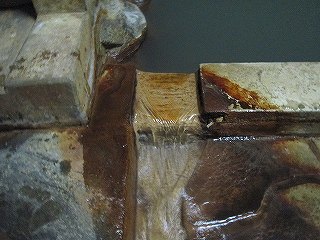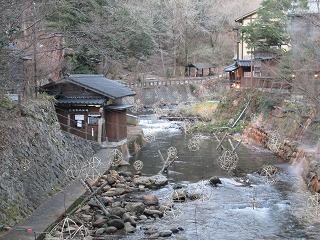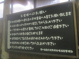※ 令和2年7月の豪雨で穴湯の建屋が流出して、現在 復活プロジェクトを立ち上げている ようです。 穴湯の近くに駐車場がありますが、温泉街の中は一方通行だったり道が狭かったりするので、 私は 温泉街を水平に横切る道路を走って温泉街を抜けた所にある無料の駐車場を利用して、 川端通りを歩いて地蔵湯に入った後 穴湯に入りました。 穴湯は 黒川温泉街の東側を流れる田の原川の川岸にあります。 ![]() ____(川岸にある穴湯)___________(川のライトアップ用の竹細工) 外観は瓦屋根の民家風で、入り口に料金箱があります。 ![]() ___(穴湯共同浴場の入り口)_______________(料金箱) 狭い脱衣所は床がスノコ板になっていて 壁に脱衣棚があります。 ※ 女性用の脱衣所は囲いの中にあります。 ![]() _______(脱衣所)________________(女性用の脱衣所) 洗い場が無いので、かけ湯をする為の洗面器があります。 ![]() _______(洗面器)______________(浴室にある注意書き) 仕切り板で2つに分けられた浴槽は 手前が3人、奥が4人入れる大きさで、温度は 手前が ぬるめで 奥が適温です。 ![]() ______(手前の浴槽)__________________(奥の浴槽) 源泉は奥の浴槽にあるホースから出ていて、手前の浴槽に 加水用の蛇口があります。 笹濁りを濃くした色の温泉は鉄の味と臭いがして、浴槽の底に 源泉を そのまま使っている 証と思われる砂粒が 少量ありました。 ![]() ___(源泉が出ているホース)_______________(蛇口) 温泉は源泉かけ流しで、浴槽からあふれた温泉は 縁の手前にある溝から出て川に流れ 落ちています。 ![]() ___(浴槽から流れ出る温泉)___________(川に流れ落ちる排水溝) 窓の戸も共同浴場らしい趣のある作りで、開けると 横を流れる田の原川が見えます。 ![]() ______(浴室の天井)____________(戸を開けて見た川の流れ) _____ - - - - - - - - - - - - - - - - - - - - - |