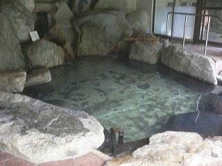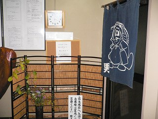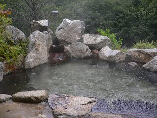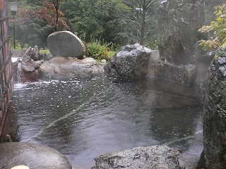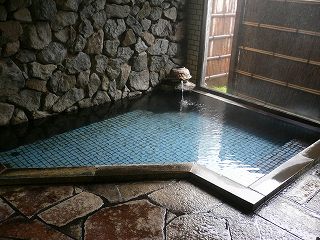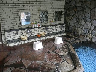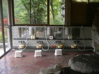長野道の豊科インターからパノラマロードを走り 信濃大町経由で約45分。 (葛温泉 仙人閣)仙人閣は日本秘湯を守る会々員の宿です。 ![]() ______(フロント)_____________(日本秘湯を守る会の提灯) フロント周りは薄暗くて いかにも山奥の旅館といった感じです。 ![]() _(浴室の入り口に掛かる湯のれん)__________(洗面ドレッシング) 浴室に入ると 手前の部屋に青いタイル張りの小さな浴槽があって、奥にある ぶんぶく茶釜 のような湯口から源泉が出ています。 ![]() ___(小さい浴室の洗い場)_____________(タイル張りの浴槽) 最初の浴室から右側のドアを開けると 丸太の梁が組まれた滝風呂があります。 (滝風呂の洗い場)滝風呂には2つの湯口があって、岩から出ている温泉は無味無臭ですが、右の竹筒から出て いる温泉は硫化水素臭がして、浴槽には 沢山の湯の花が浮遊しています。 (大きな岩を組んだ滝風呂)滝風呂の外にある露天岩風呂は野天風呂のようなロケーションで、目の前を流れる川の 対岸は自然林の大きな山なので、秋の紅葉のシーズンに入浴するのも良さそうです。 (露天岩風呂、湯面に雨の波紋)隣にある露天風呂の仙人風呂は 岩造りの大きな浴槽の半分まで竹の柵で目隠しされた 半混浴です。 ※ 竹柵と湯面の間に10センチほどの隙間があるので、女性は安心できないかも・・。 (大量の源泉が投入されている仙人風呂)無色透明の温泉は わずかに温泉臭がして やさしい肌触りです。 全ての浴槽が源泉掛け流しで カランにも温泉が使われているようです。