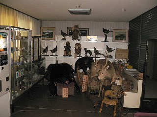 ロビーが薄暗いのは 沢山の剥製を日差しから守る為に閉めっぱなしになったカーテンの 為なので、剥製を保護する箱に入れてカーテンを開けたら もっと明るくなると思うのだが・・ でも この寂びれた感じが秘湯ファンにはたまらないのかも知れません。 (ロビーの剥製)