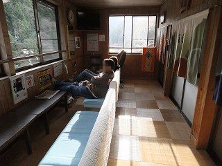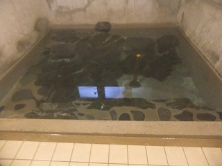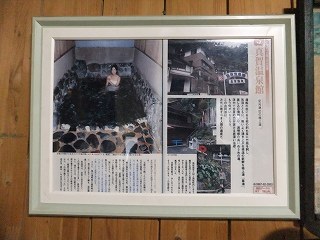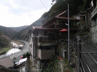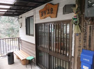 米子自動車道の湯原インターから313号線を南下して約10分(5Km)ですが、道路の横にある 駐車場は5台分しかありません。 道路沿いの駐車場から 山の斜面に作られた石段を登ります。 ![]() ____(真賀温泉の看板)_________________(石段) 真賀温泉館は 山の斜面に張り付くように建てられた建物の一番上にあります。 ![]() ___(山の斜面に建つ真賀温泉)_____________(真賀温泉館) 真賀温泉館の右上に薬師如来を祀る神社があって、その石段の横にある温泉の成分表に よると 源泉名は真賀温泉で、泉質は アルカリ性単純温泉です。 ![]() _______(薬師如来)_______________(温泉の成分表) 玄関を入ると 左に入浴券の券売機と受付があって・・ ![]() ________(入り口)____________(受付、窓口の上に料金表) 玄関周りには 色々なことが書かれたものがあります。 ![]() ___(手書きの真賀温泉の案内)___________(療養温泉番付表) ![]() _____(温泉分析書他)____________(幕湯を紹介した本のコピー) 受付の奥が待合室になっていて、その右に普通湯(150円)の女湯と男湯・混浴の幕湯 (250円)・家族湯の玉乃湯(3人まで1000円)の4つの浴室の入り口が並んでいって、 別の階に 家族湯の泉湯と旭湯があるそうです ![]() ______(幕湯を待つ客)__________(浴室の入り口に掛かる湯のれん) この時の幕湯には待ち人がいたので、私は 普通湯に入りました。 普通湯の脱衣所は狭くて、左の壁に鏡と籐製の脱衣籠があって 右の壁に脱衣棚があります。 ※ 脱衣棚の画像の左下にあるのは清掃用の高圧洗浄器です。 ![]() ______(鏡と脱衣籠)________________(脱衣棚) 浴室と脱衣所を仕切る壁が透明のガラス戸なので盗難の心配は無いと思いますが、貴重品は 待ち込まない方が良いでしょう。 (浴槽から見た脱衣所)浴室は 半分から下がコンクリート作りで、壁と天井が板張りになってます。 (浴室)右の壁に蛇口と鏡と石けん箱がありますが 石けん類は置いてありません。 (蛇口と鏡と石鹸箱)浴槽は 天然の岩に四角い囲いを付けたような作りで、浴槽の底に取り付けられた竹筒から 源泉が湧き出ています。 浴槽の一番深い所は胸元まであって、時折 岩の間から泡が出ています。 ![]() ____(浴槽、中央に竹筒)______________(竹筒から出る温泉) 100%の源泉掛け流しの温泉は無色透明・無味無臭にツルスベの肌触りで、浴槽から あふれた温泉は 両端の溝からオーバーフローになっています。 (浴槽からあふれる温泉)料金が格安なうえに 源泉かけ流しの温泉を貸切の状態で利用出来て大満足しました。 _____ - - - - - - - - - - - - - - - - - - - - |