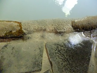 こちらも源泉掛け流しで 浴槽からあふれた温泉が排湯溝から流れ出ています。