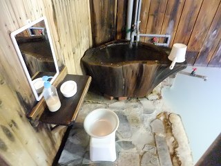 木の株をくり抜いた槽から お湯を汲んで使います。