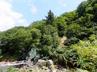 _(対岸の自然林、左下に 洞窟風呂)_______(露天風呂の横を流れる川)