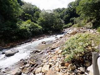露天風呂には目隠しの塀が無いうえに隣を川が流れ、対岸には自然林が広がっているので