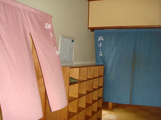 浴室は 受付から長い廊下を歩いた先にあって、廊下を歩いている時に 清掃で開いていた